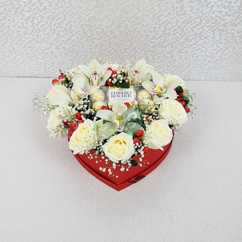 Новый год – это прекрасный повод признаться в любви или сделать предложение. Поэтому мы предлагаем вам заказать коробку с розами и орхидеями в форме сердца. Мы дополняем эту композицию конфетами, чтобы признание было еще слаще.